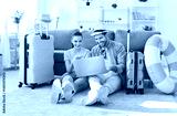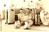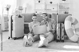 Happy newlywed couple online booking flight tickets, tourists suitcases packed, wheel luggage in summer beach wear hat, sunglasses, ready enjoying tourism, voyage, trip vacation, honeymoon planning