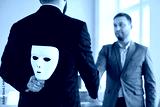 Back view of man in suit hiding white mask behind his back while shaking hands with male colleague in office. Concept of hypocrisy, deception, dishonesty, false promises or insincerity in partnership.