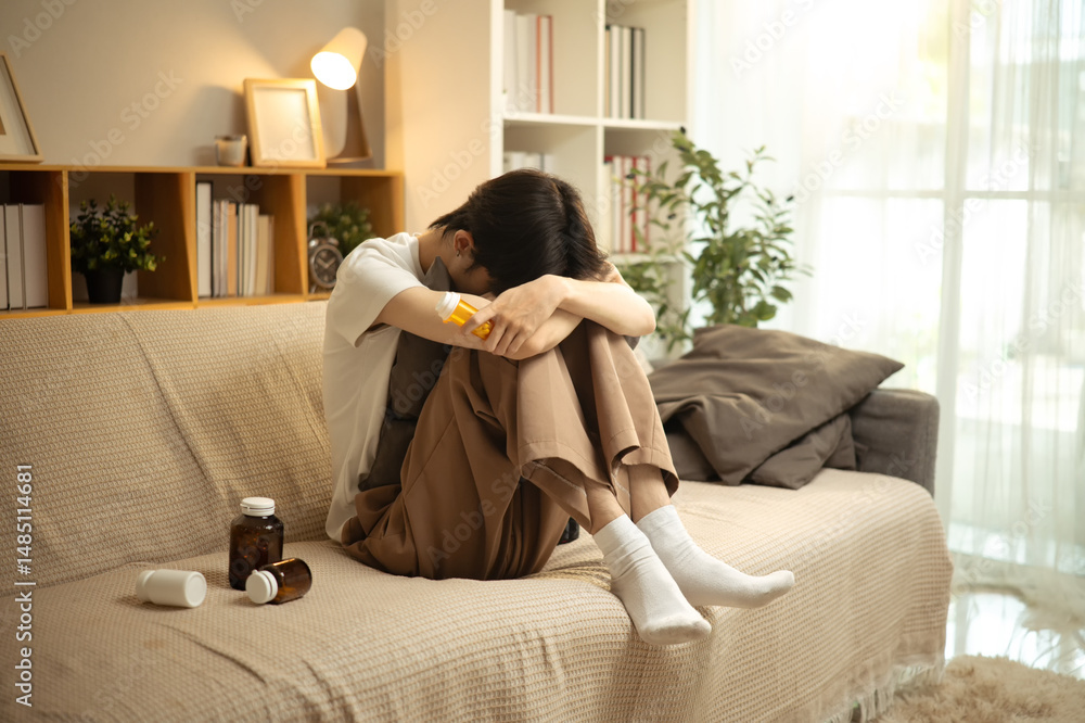 Depressed young man sitting on sofa, hugging knees surrounded by medicine bottles