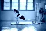 Young woman stretching on yoga mat in a cozy home, practicing fitness and flexibility