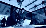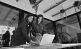 Professional female colleagues partners team having conversation using tablet and laptop at work. Two happy busy business women talking working together in green office standing at desk. Low angle