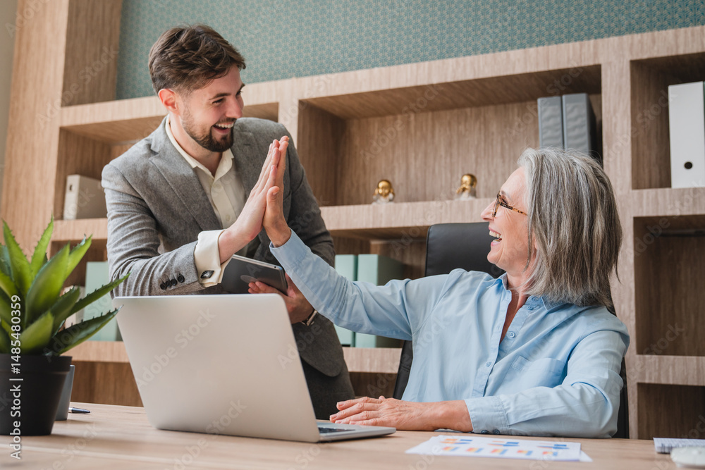 Mature Businesswoman giving hi five touching hands with co worker after finish work and completed the work perfectly, as expected. Happy team giving hight five after successful work