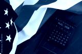 August 2026 black monthly desk calendar and United States of America flag.