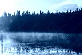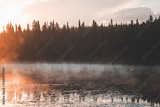 morning hike at sunrise in canada, by a pine tree forest, with misty air and pastel colours, full moon and pale clouds in the sky, by the little quiet pond