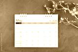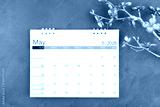 Desk calendar for May 2026 year with gold cherry blossoms branch.