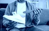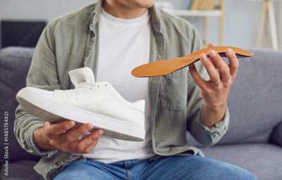 Unrecognizable adult man sitting on a sofa at home and holding a new white sneaker and a beige orthopedic insole. Sports footwear, orthopedic shoes, flatfoot treatment, comfort concept