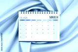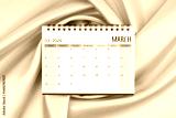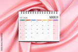 March 2026 desk calendar on pink silk textile background, Flat lay.