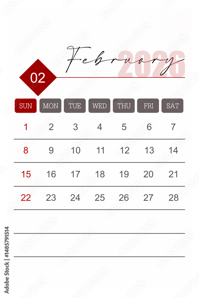Calendar February 2026 flat style isolated on white background, Save clipping path.