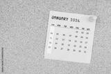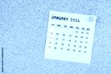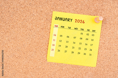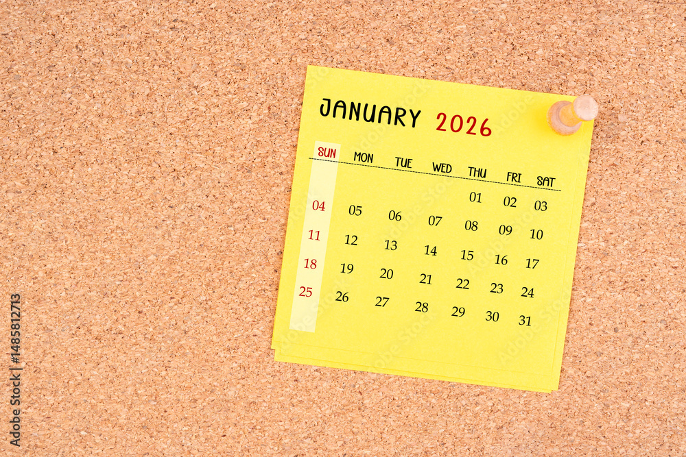 Yellow calendar sheet for January 2026 with thumbtack on board.