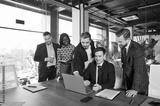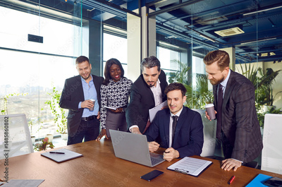 Young smiling business man showing work project to his colleagues on laptop computer while sitting in meeting room in office. Smiling people chatting at conference discussing company finance.