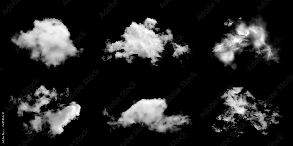 Set of white clouds or fog for design isolated on black background.