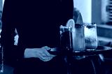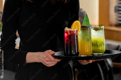 A person in a black outfit holding a tray with three colorful cocktails, garnished with fresh fruits and mint. Vibrant drinks served in elegant glasses, perfect for a bar or restaurant setting