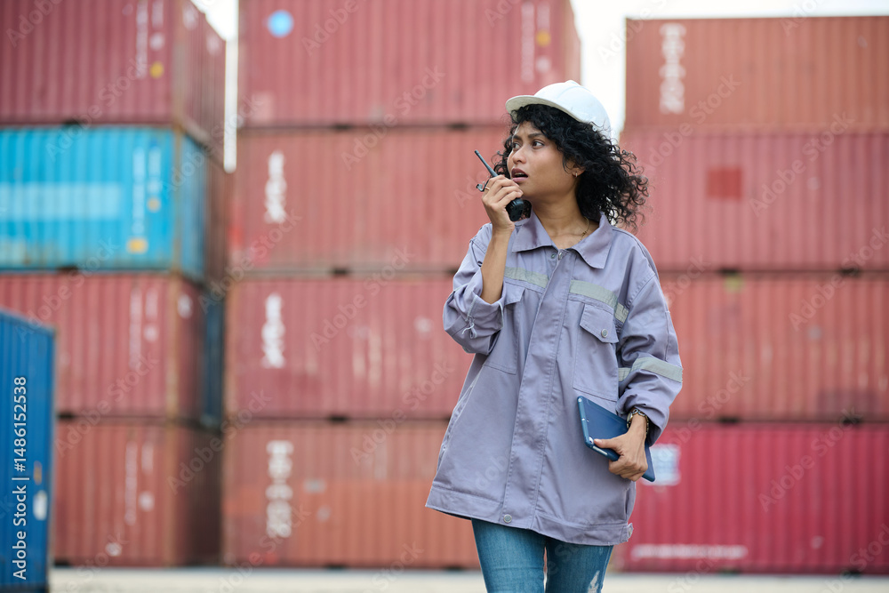 Engineer or worker using walkie talkie and talking about work in containers warehouse storage