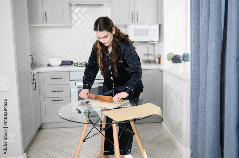 Woman preparing dough for baking, rolling it out on kitchen table at home. Housewife preparing food, going to cook pasta, pizza, croissants, sweets. Concept cooking