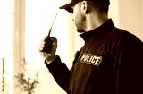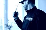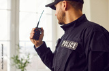 Policeman speaks into portable radio conveying orders or coordinating efforts in line of duty. Serious policeman in uniform with POLICE patch uses hand-held radio to communicate while standing indoors