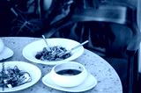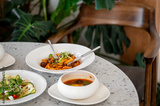 A table setting with three dishes: soup in a bowl, pasta with vegetables and herbs, and sliced zucchini with greens. The scene includes a wooden chair and lush green plants, creating a cozy atmosphere
