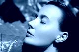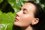 Peaceful young woman with wet dark hair and glowing skin relaxes with closed eyes in sunlight, surrounded by large tropical green leaves. Connection with a nature.