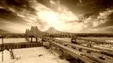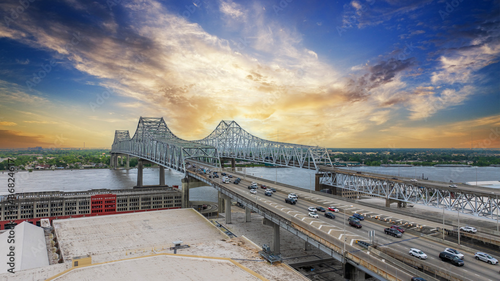 aerial shot of cars and truck driving on the Crescent City Connection bridge over the Mississippi River in New Orleans Louisiana USA