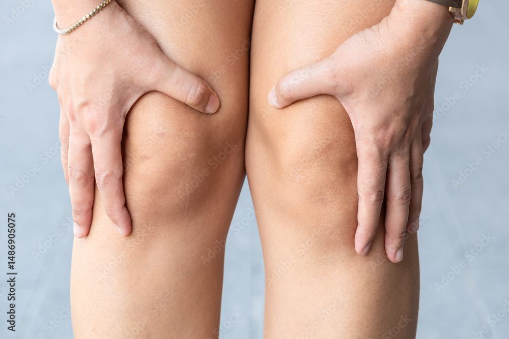 Woman with knee pain, he puts his hand on his knee, pain point from osteoarthritis and osteoarthritis, medical concept and treatment