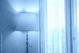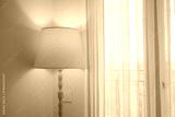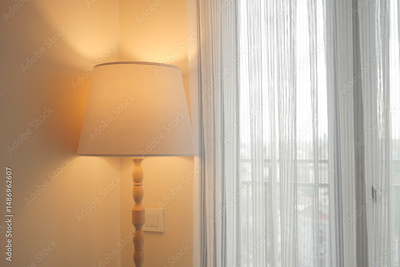 Warm vibe from lamp by sheer curtains
