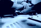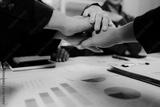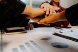 A group of professionals collaborates in an office, analyzing financial graphs and documents to strategize business growth and project success.