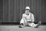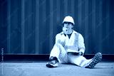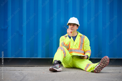 Worker or engineer using walkie talkie and talking about work in containers warehouse storage