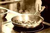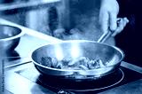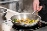 A professional chef cooks fresh vegetables, including broccoli, potatoes, and bell peppers, in a stainless steel pan on an induction stove. Steam rises as the food is sautéed or stir-fried
