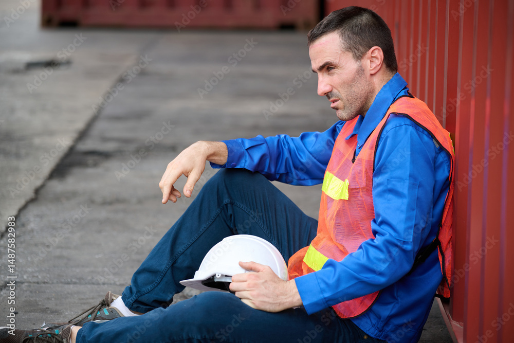 Worker or engineer feeling tired and disappointed from work in containers warehouse storage