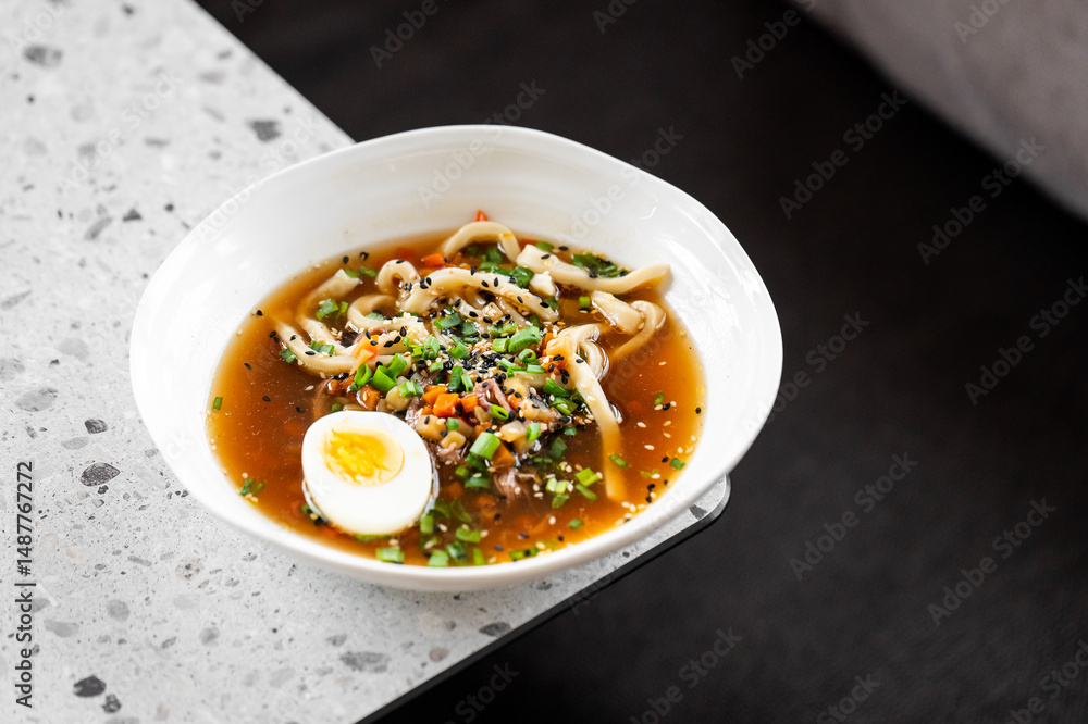 A bowl of ramen with noodles, a halved boiled egg, chopped green onions, carrots, and sesame seeds, served on a speckled countertop. Traditional Japanese cuisine, fresh and appetizing
