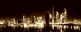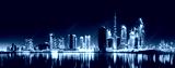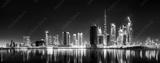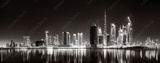 Urban city skyline with illuminated skyscrapers and waterfront railing in black and white at night, Dubai Marina bay UAE