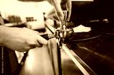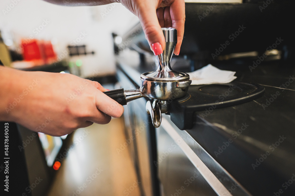 A barista presses ground coffee into a portafilter using a tamper, preparing for espresso extraction in a modern coffee shop. The close-up highlights precision, skill, and professional equipment