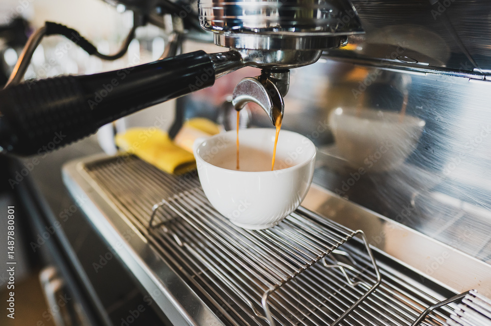 A close-up view of an espresso machine brewing fresh coffee into a white cup, showcasing the rich, dark liquid flowing from the spout. Perfect for themes of coffee culture, barista craft