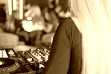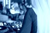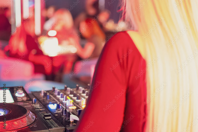 A DJ performing at a nightclub, focused on mixing tracks with professional equipment. The vibrant atmosphere, colorful lights, and engaged crowd create an energetic party scene