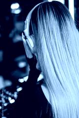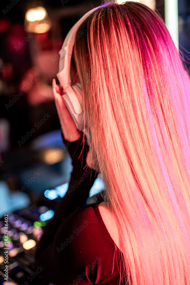 DJ with long blond hair, wearing headphones, working at the mixing console in a dark room with bright colored lights. Club party atmosphere, music, technology and creativity