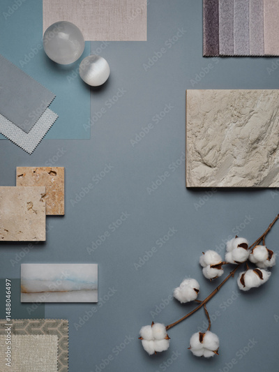 A refined blue and white palette with cotton flowers, marble, and soft textiles, evoking a tranquil and modern aesthetic.