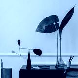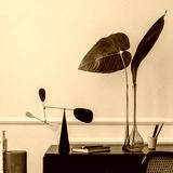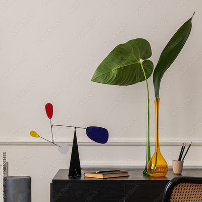 Modern composition of workplace interior with black desk, rattan chair, colorful sculpture, vase with leaves, rack, books, wall with stucco and personal accessories. Home decor. Template.