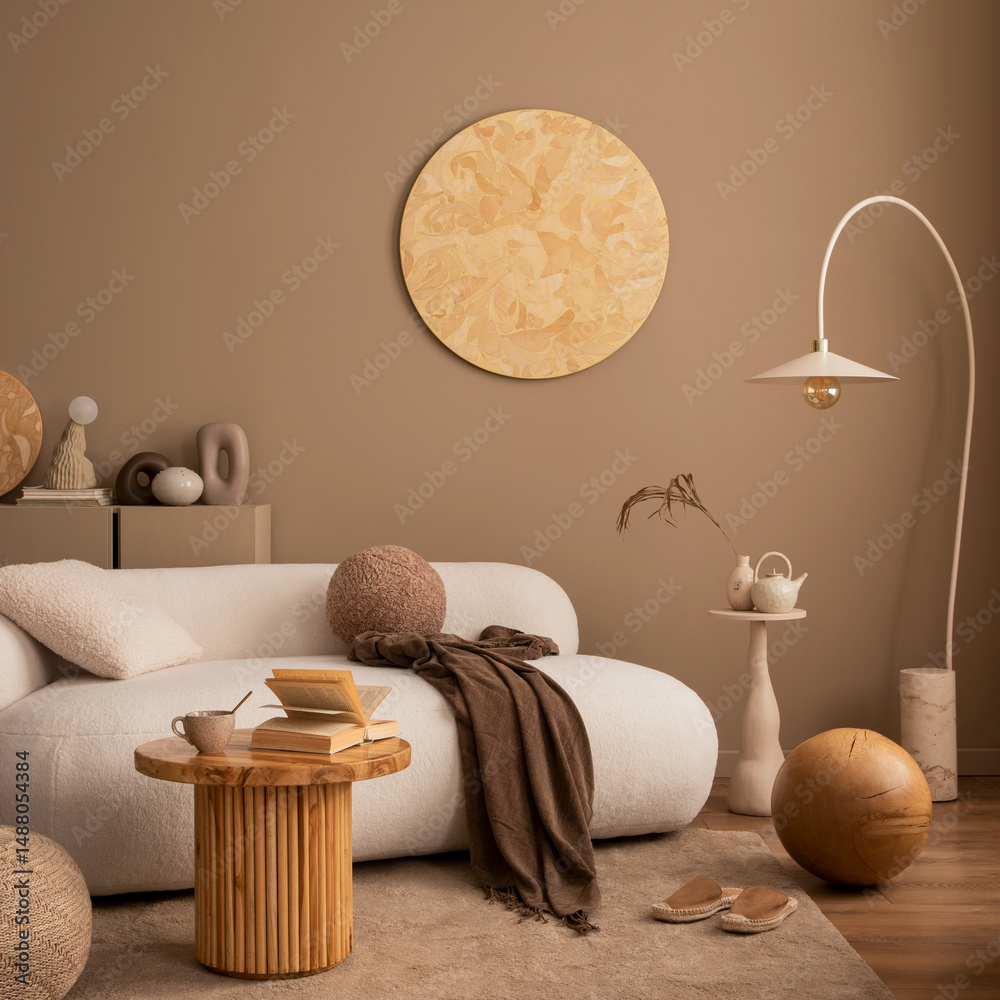 Interior design of cozy living room with wooden wall panel, stylish sofa, round coffee table, braided pouf, brown sideboard, vase with branch, beige lamp and personal accessories. Home decor. Template