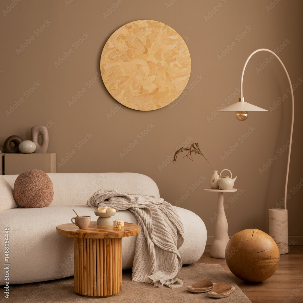 Interior design of cozy living room with wooden wall panel, stylish sofa, round coffee table, braided pouf, brown sideboard, vase with branch, beige lamp and personal accessories. Home decor. Template