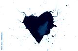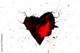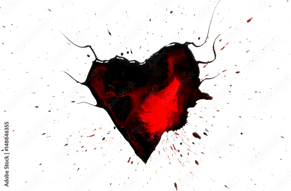 Black heart with horns with red drops and stains and black paint spray around isolated on white background.