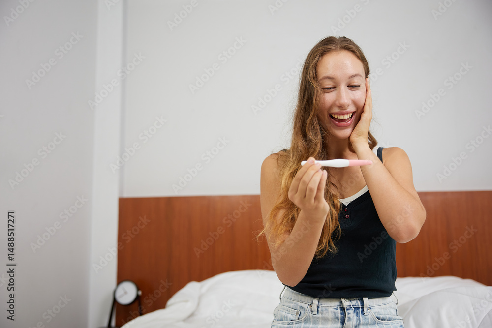 young woman looking at pregnancy test and smiling while sitting on bed at home