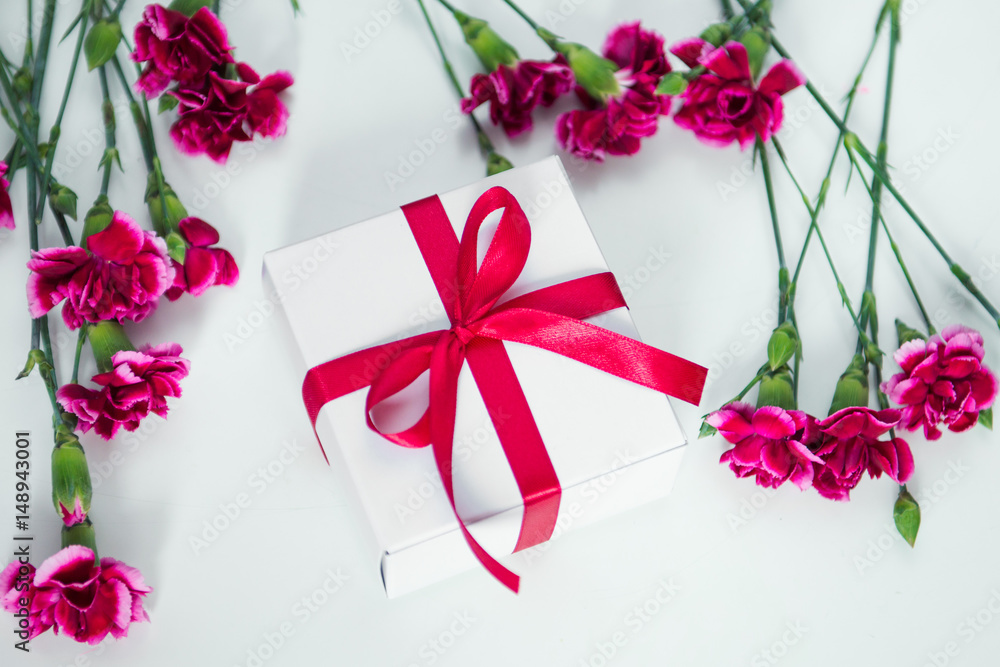 carnations around a small gift box