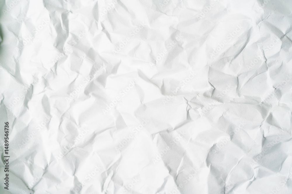 Close-up of crumpled white paper, showcasing its texture and subtle shadows. The irregularities create a sense of depth and complexity, perfect for artistic backgrounds or minimalist designs concept