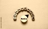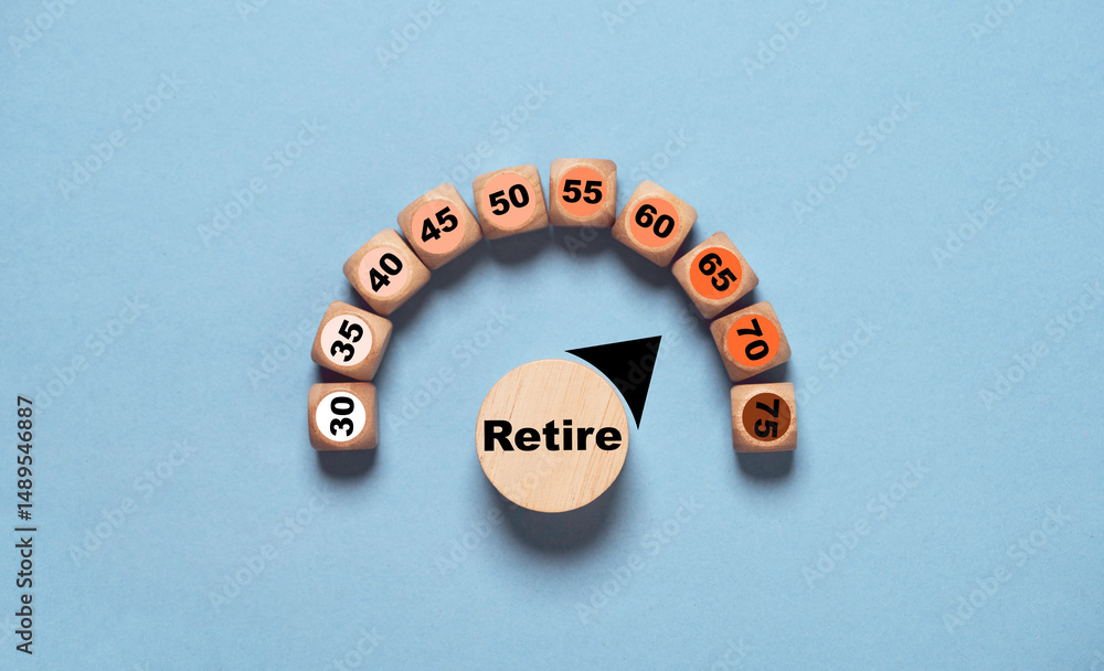 Wooden blocks arranged in a semicircle with numbers representing different ages, centered around a block labeled "Retire." It suggests the concept of retirement and age concept.