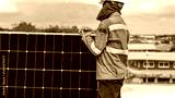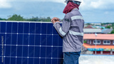 Technician Installing Solar Panels on Rooftop for Renewable Energy System