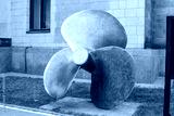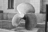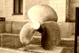 Large Modern Metal Propeller Sculpture in Urban Park Setting with Building Background