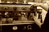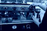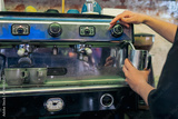 A barista operates a professional espresso machine, preparing coffee. The image captures the process of making espresso, highlighting the machine's controls, portafilter, and steam wand, with cups