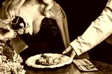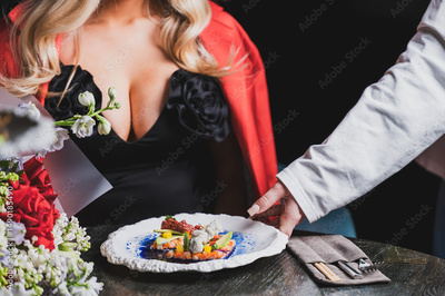 Elegant woman in black dress with red shawl seated at a fine dining table. Gourmet dish being served. Romantic atmosphere with flowers and stylish table setting