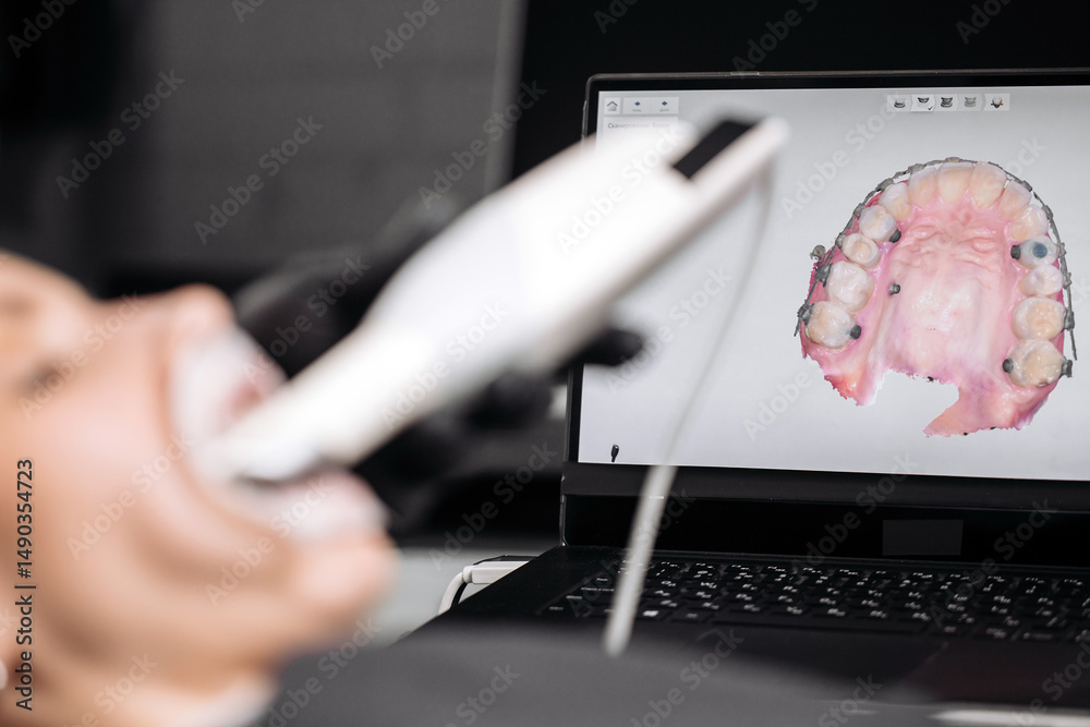 Dentist performing 3D oral scanning with an intraoral scanner in a modern dental clinic. Concept dental technology, 3D scanning, professional care, modern dentistry.