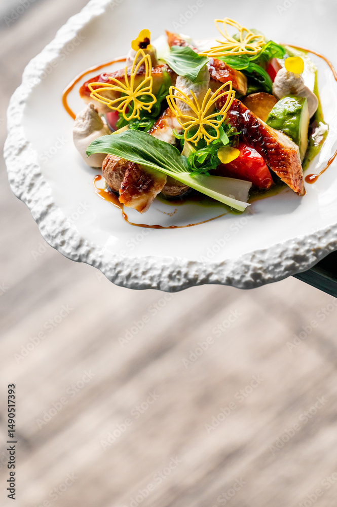 A gourmet dish with vibrant vegetables, fresh greens, succulent meat, and delicate yellow edible flowers, elegantly plated on a textured white plate with artistic sauce presentation