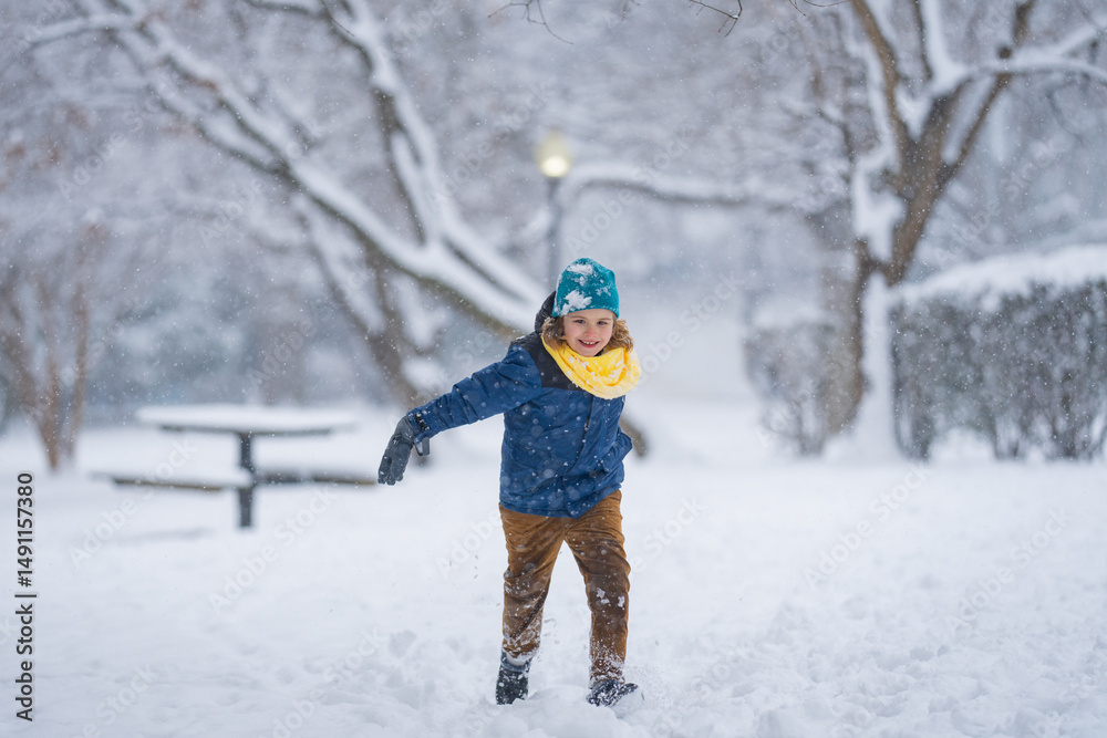 Happy Child playing with snow, outdoors during snowfall. Winter child, outdoor portrait. Child play in the snow. Child play in snow park. Winter kid face. Kid teen boy in snow. Winter kids activity.